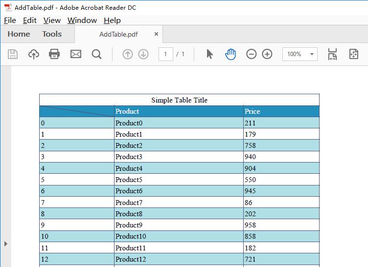 Table table = new Table(); RgbColor bordersColor = new RgbColor(73, 90, 128); RgbColor headerColor = new RgbColor(34, 143, 189); RgbColor defaultRowColor = new RgbColor(176, 224, 230); Border border = new Border(1, BorderStyle.Single, bordersColor); table.Borders = new TableBorders(border); table.DefaultCellState.Borders = new TableCellBorders(border, border, border, border); table.DefaultCellState.Padding = new System.Windows.Thickness(2); //Add table title TableRow titleRow = table.Rows.AddTableRow(); TableCell titleCell = titleRow.Cells.AddTableCell(); titleCell.ColumnSpan = 3; Block titleBlock = titleCell.Blocks.AddBlock(); titleBlock.HorizontalAlignment = HorizontalAlignment.Center; titleBlock.InsertText("Simple Table Title"); //Add table header TableRow headerRow = table.Rows.AddTableRow(); //Add first column TableCell column1 = headerRow.Cells.AddTableCell(); column1.Background = headerColor; column1.Borders = new TableCellBorders(border, border, border, border, null, border); //Add second column TableCell column2 = headerRow.Cells.AddTableCell(); column2.Background = headerColor; Block column2Block = column2.Blocks.AddBlock(); column2Block.GraphicState.FillColor = RgbColors.White; column2Block.InsertText("Product"); //Add third column TableCell column3 = headerRow.Cells.AddTableCell(); column3.Background = headerColor; Block column3Block = column3.Blocks.AddBlock(); column3Block.GraphicState.FillColor = RgbColors.White; column3Block.InsertText("Price"); //Add table rows Random r = new Random(); for (int i = 0; i < 50; i++) { RgbColor rowColor = i % 2 == 0 ? defaultRowColor : RgbColors.White; TableRow row = table.Rows.AddTableRow(); TableCell idCell = row.Cells.AddTableCell(); idCell.Background = rowColor; idCell.Blocks.AddBlock().InsertText(i.ToString()); TableCell productCell = row.Cells.AddTableCell(); productCell.Background = rowColor; productCell.Blocks.AddBlock().InsertText(String.Format("Product{0}", i)); TableCell priceCell = row.Cells.AddTableCell(); priceCell.Background = rowColor; priceCell.Blocks.AddBlock().InsertText(r.Next(10, 1000).ToString()); } return table;